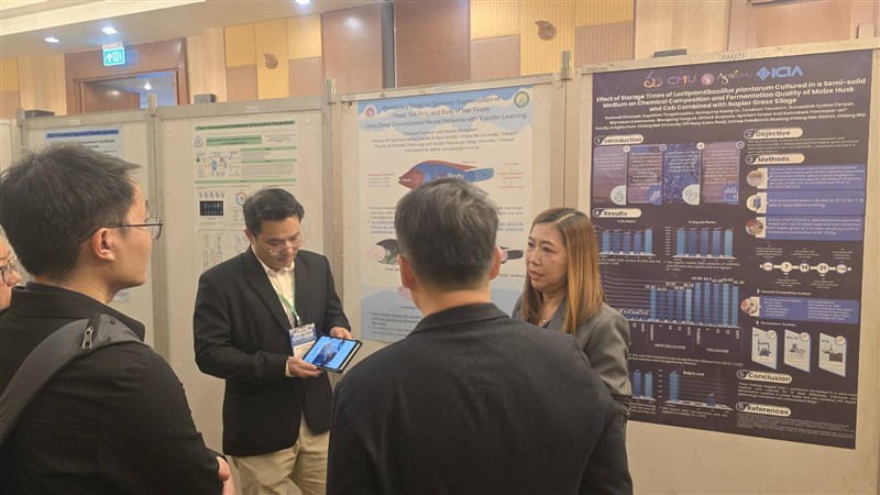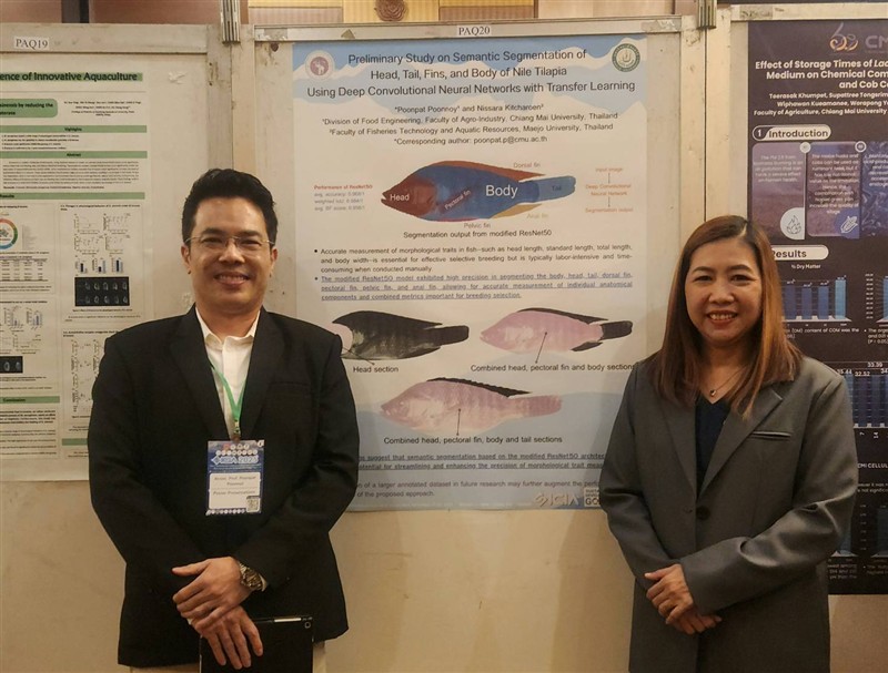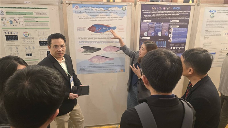 รองศาสตราจารย์ ดร. นิสรา กิจเจริญ คณะเทคโนโลยีการประมงและทรัพยากรทางน้ำ มหาวิทยาลัยแม่โจ้ และรองศาสตราจารย์ ดร.พูนพัฒน์ พูนน้อย ภาควิชาวิศวกรรมอาหาร คณะอุตสาหกรรมการเกษตร มหาวิทยาลัยเชียงใหม่ ได้รับรางวัล Best Poster Presentation Award เรื่อง Preliminary Study on Semantic Segmentation of Head, Tail, Fins, and Body of Nile Tilapia Using Deep Convolutional Neural Networks with Transfer Learning ในงาน The 2nd International Conference of Innovative Aquaculture (ICIA2025) ระหว่างวันที่ 27–28 พฤศจิกายน 2568 ณ โรงแรมแชงกรี-ลา เชียงใหม่