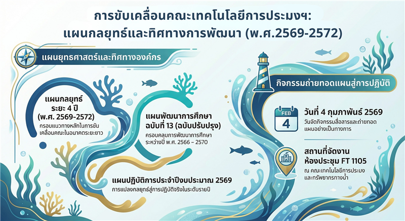 ในวันพุธที่ 4 กุมภาพันธ์ พ.ศ. 2569 คณะผู้บริหารคณะเทคโนโลยีการประมงและทรัพยากรทางน้ำ มหาวิทยาลัยแม่โจ้ นำโดย รองศาสตราจารย์ ดร.อภินันท์ สุวรรณรักษ์ คณบดี รองศาสตราจารย์ ดร.ชนกันต์ จิตมนัส รองคณบดีฝ่ายวิชาการและประกันคุณภาพการศึกษา ผู้ช่วยศาสตราจารย์ ดร.อุดมลักษณ์ สมพงษ์ รองคณบดีฝ่ายวิจัยและบริการวิชาการ และ อาจารย์ ดร.โดม อดุลย์สุข รองคณบดีฝ่ายพัฒนานักศึกษาและกิจการพิเศษ ได้จัดกิจกรรมถ่ายทอดแผนกลยุทธ์ ระยะ 4 ปี (พ.ศ.2569-2572) แผนปฏิบัติการประจำปี พ.ศ.2569 (ภารกิจเชิงรุก) แผนพัฒนาการศึกษา ฯ ฉบับที่ 13 (พ.ศ.2566 - 2570) ฉบับปรับปรุง และแผนปฏิบัติการคณะเทคโนโลยีการประมงและทรัพยากรทางน้ำ ประจำปีงบประมาณ พ.ศ.2569 ให้แก่คณาจารย์ บุคลากร และตัวแทนนักศึกษา เพื่อสร้างความเข้าใจต่อแนวทางและเป้าหมายของแผนคณะให้เป็นไปในทิศทางเดียวกัน โดยภายในกิจกรรมได้มีการแลกเปลี่ยน และแสดงความคิดเห็นระหว่างผู้บริหารและผู้เข้าร่วมกิจกรรม เพื่อประโยชน์ต่อการพัฒนาองค์กร