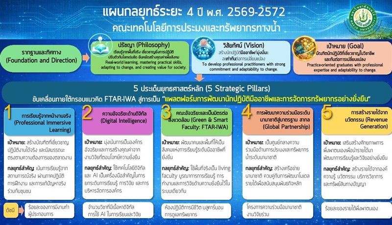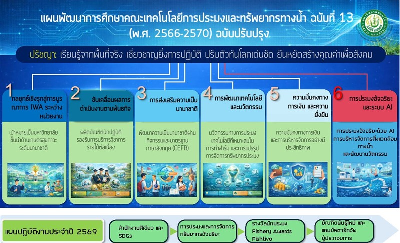 คณะกำหนดทิศทางการพัฒนาเชิงยุทธศาสตร์ให้สอดคล้องกับกรอบ SPO–Inter IWA โดยมุ่งเน้น (1) การจัดการเรียนรู้เชิงประสบการณ์วิชาชีพที่มุ่งเน้นการลงมือปฏิบัติจริง (Professional Immersive Learning) เพื่อพัฒนานักปฏิบัติด้านการประมงและทรัพยากรทางน้ำที่มีสมรรถนะตามบริบทสากล (2) การขับเคลื่อนผลการดำเนินงานตามพันธกิจหลัก (Driving Mission – Driven Performance) ด้วยการใช้ข้อมูล เทคโนโลยีดิจิทัล และปัญญาประดิษฐ์เป็นฐานการตัดสินใจ (3) การพัฒนาคณะสู่การเป็นคณะอัจฉริยะและเป็นมิตรต่อสิ่งแวดล้อม (Green & Smart Faculty) ภายใต้กรอบ FTAR-IWA (4) การเสริมสร้างความเป็นนานาชาติ (Fostering Internationalization) ผ่านความร่วมมือด้านการศึกษา วิจัย และบริการวิชาการ และ (5) การบริหารจัดการและเสริมสร้างความมั่นคงทางการเงินอย่างยั่งยืน (Financial Stability and Sustainable Growth)